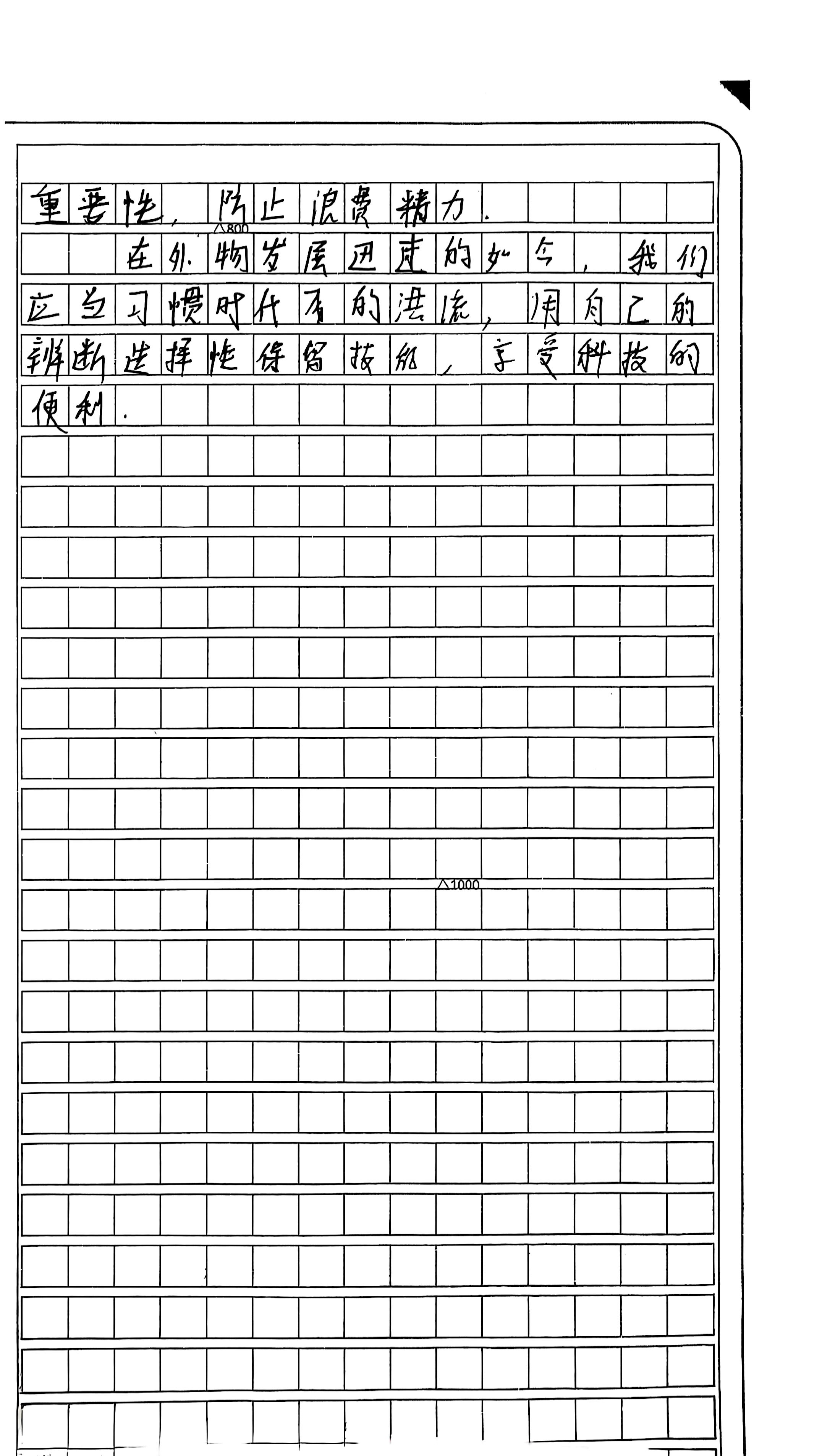 语文D 老师点评: 同学你好,很高兴批改你的作文,评价如下:问题一:本篇文章在文章的结构段落上存有明显拖沓、与主题无关的句子,主要是因为作者在动笔之前对于整篇文章的结构段落包括分论点的设置上没有合理的规划,所以建议在文章动笔之前构思好文章结构。问题二:文章议论和事例以及道理的举证在比例上不够平衡。虽然对于议论文来说,最主要的要落脚于议论,但并不能空发议论,需要有的放矢,要针对具体的、典型的社会事件做自己的分析,这样才能增强文章的说服力。表扬一:文章虽然整体引用的示例不多,但是对于事例论证以及道理论证的运用还是比较不错的,文章的可读性强,内容充实,也有对于社会热点的分析思考,这一点还是十分不错的,继续保持。