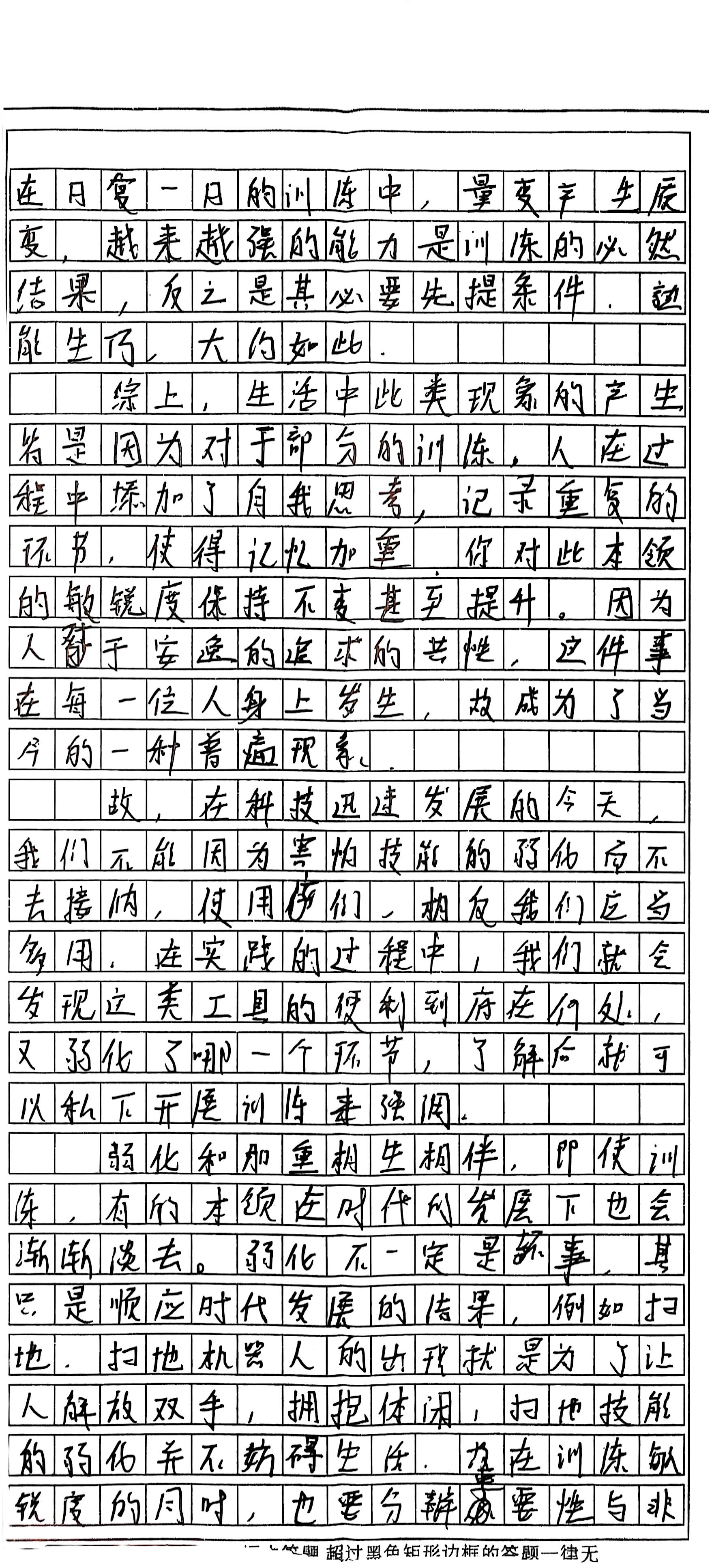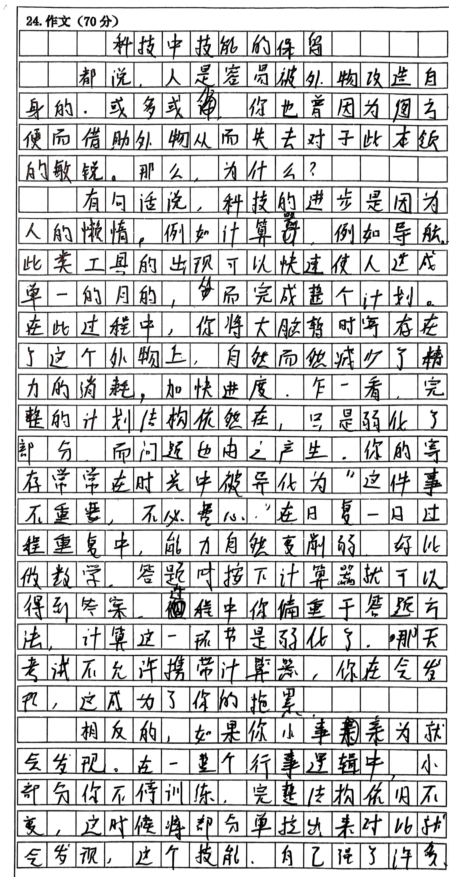 teacher-C|teacher-C 老师点评: 【优点】1.主题明确,紧扣题意:全文围绕“科技工具导致能力退化与自主训练强化技能”的核心矛盾展开,多次呼应题目中的例子,并延伸到其他生活场景。2.逻辑框架清晰:采用“现象描述→原因分析→对比论证→解决方案”的结构,层次分明。先提出问题,再通过正反例证对比,最后给出平衡策略,整体论证链条完整。3.生活化案例丰富:使用数学考试、扫地机器人等贴近学生经验的场景,增强说服力和代入感,便于读者理解抽象观点。4.辩证思维初现:结尾提到“弱化不一定是坏事”,承认部分技能被淘汰的合理性,体现对技术的包容态度,避免片面否定科技进步,展现一定的思辨深度。5.语言生动性尝试:运用比喻和俗语引用,试图让论述更鲜活有趣。【需要改进的地方】1.语言表达问题搭配不当与语法错误:这类错误会影响句子的基本通顺性,需调整措辞。指代模糊:“此本领”“外物”等代词缺乏明确前文锚定,易造成歧义,建议具体化对象。口语化倾向:如“哪天考试不允许携带计算器”、“这件事不重要”,过于随意,可替换为书面化表达。2.逻辑严谨性不足因果链条断裂:“使用计算器→减少精力消耗→能力变弱”的推导过于简略,可补充心理学依据增强说服力。绝对化表述:“你定会发现”、“皆是因为”等绝对化用语削弱论证可信度,可以改为“很可能”、“往往源于”等留有余地的说法。概念混淆:“计划结构依旧不变”中的“结构”定义不清,是指解题步骤还是认知框架?需明确界定关键概念。3.结构优化空间段落衔接生硬:部分段落间缺乏过渡句,导致思路跳跃。可添加承上启下的短句平滑转折。例证堆砌有余,分析不足:列举多个例子但未深入剖析共性规律,建议选取1-2个典型事例进行深度拆解。结论仓促收束:结尾仅停留在“选择性保留技能”的表层建议,可以适当升华。4.思想深度待提升停留于表象观察:主要停留在“用进废退”的经验层面,未触及认知科学原理。引入跨学科知识可增厚论述底蕴。缺乏历史维度:未提及人类历来如何应对技术变革,错失纵向比较的视角。对策空泛化:“私下开展训练”等建议可操作性弱,可设计具体方案。5.标题“科技中技能的保留”紧扣材料核心,但表述稍显模糊。它点出了科技与传统技能的冲突,却未明确动态平衡的关键,可以适当调整。例如:《科技浪潮中的技能坚守》、《执剑还是归鞘?论数字时代的人类技艺》等。